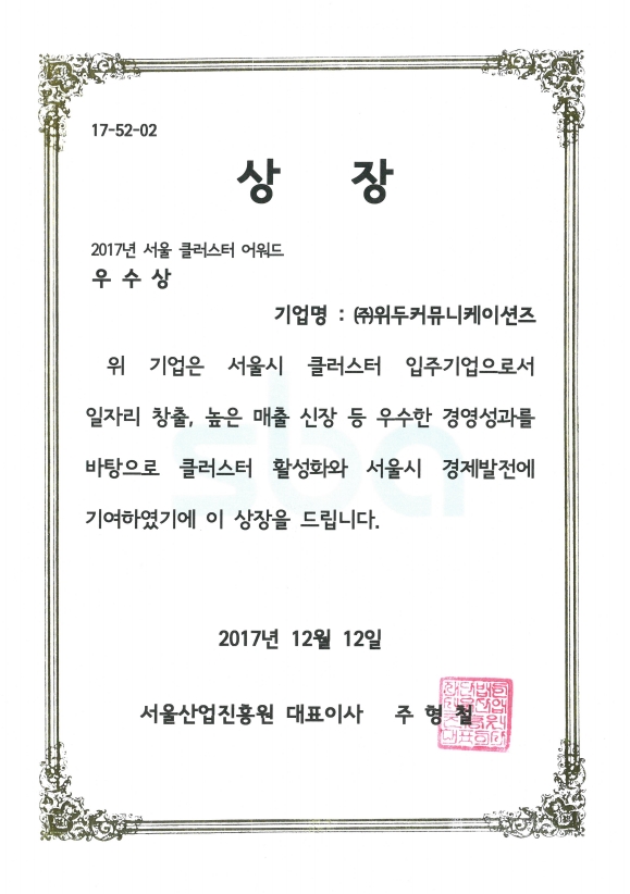 서울클러스터 어워드 우수상 페이지 정보 작성자 WeDu 댓글 0건 조회 6,594회 작성일 19-05-30 19:34 본문 2017-12-12 우수상 17-52-02 서울클러스터 어워드 서울산업진흥원 대표이사 주형철 List Previous서울특별시장 표창장 19.05.30 Next산업통상자원부 표창장 19.05.30