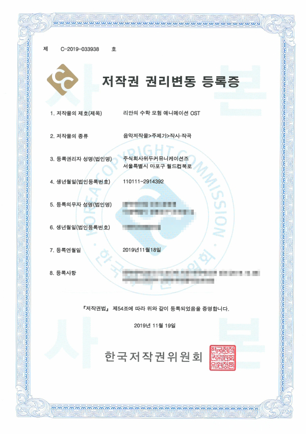 [한국/저작권] 리안의 수학 모험 애니메이션 OST 페이지 정보 작성자 WeDu 댓글 0건 조회 6,208회 작성일 19-11-25 13:54 본문 2019-11-18 저작권 C-2019-033938 음악저작물>주제가>작사·작곡 List Previous[한국/저작권] 리안의 수학 모험 여정의 시작 1,2,3,4,5 21.12.31 Next[한국/저작권] 애니메이션 리안의 수학 모험 19.11.25