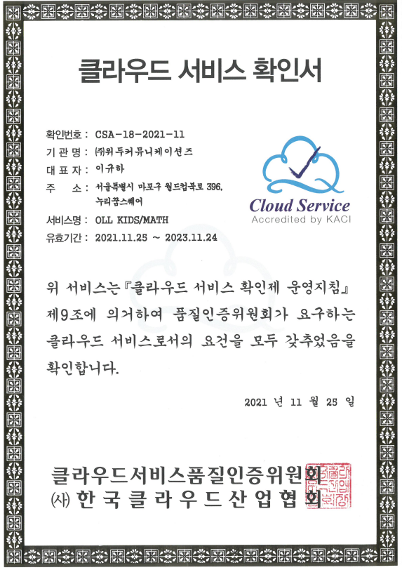 [한국/인증서] OLL KIDS/MATH 클라우드 서비스 확인서 페이지 정보 작성자 WeDu 댓글 0건 조회 9,014회 작성일 21-12-31 12:46 본문 2021-11-25 확인번호 CSA-18-2021-11 서비스명 : OLL KIDS/MATH List Previous[한국/확인서] OLL KIDS/MATH 파스-타 호환성 확인서 21.12.31 Next[한국/저작권] 장보기 인지훈련 게임 21.12.31