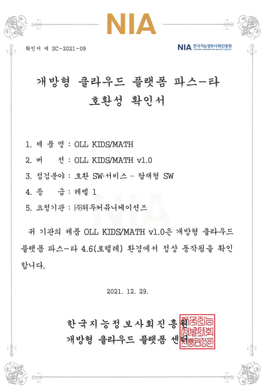 [한국/확인서] OLL KIDS/MATH 파스-타 호환성 확인서 페이지 정보 작성자 WeDu 댓글 0건 조회 9,417회 작성일 21-12-31 12:48 본문 2021-12-29 확인서 제 SC-2021-09 점검분야 : 호환 SW서비스 - 탑재형 SW List Next[한국/인증서] OLL KIDS/MATH 클라우드 서비스 확인서 21.12.31